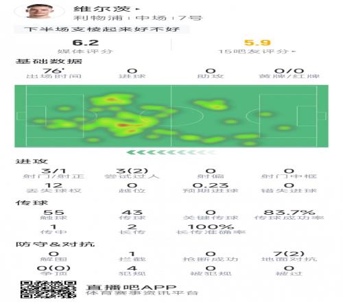 体育播报1月22日宣 在本轮欧冠利物浦对阵马赛比赛中,维尔茨首发,以下为他在本场数据: