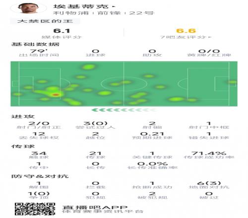 体育播报1月22日宣 在本轮欧冠利物浦对马赛的比赛中,埃基蒂克首发出场,以下为他在本场数据: